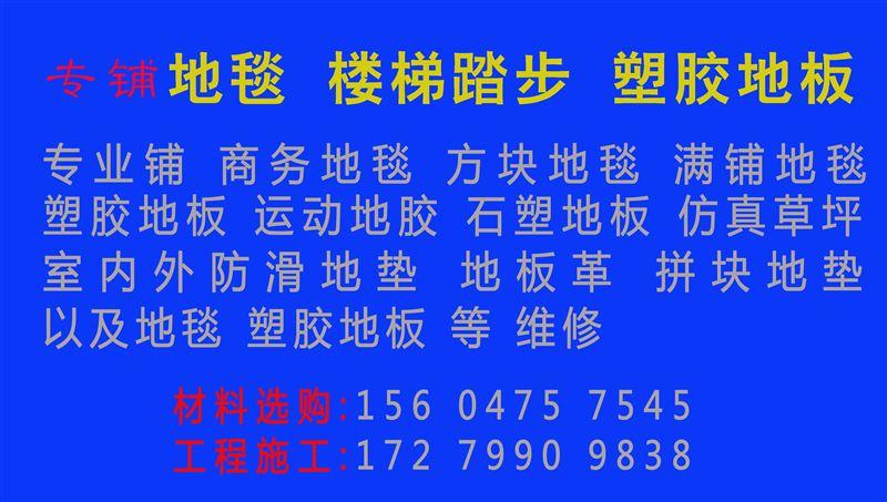 專業(yè)鋪地毯,樓梯踏步,塑膠地板。專業(yè)鋪商務(wù)地毯,方塊地毯,滿鋪地毯,塑膠地板,運動地膠,石塑地板,仿真草坪,室內(nèi)外防滑地墊,地板革,拼塊地墊。地毯、塑膠地板維修等。